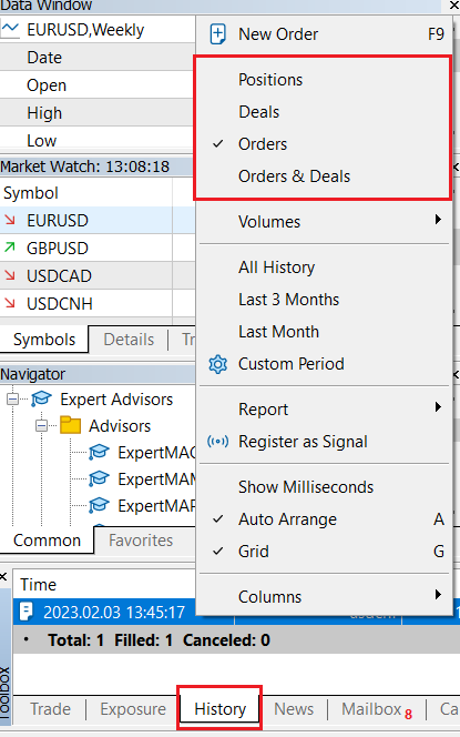 ستكون أوامر MT5 التاريخية متسقة مع عرض أوامر MT4 التاريخية ، وسيضيف فتح وإغلاق الأمر ما يصل إلى رقم الأمر ؛
