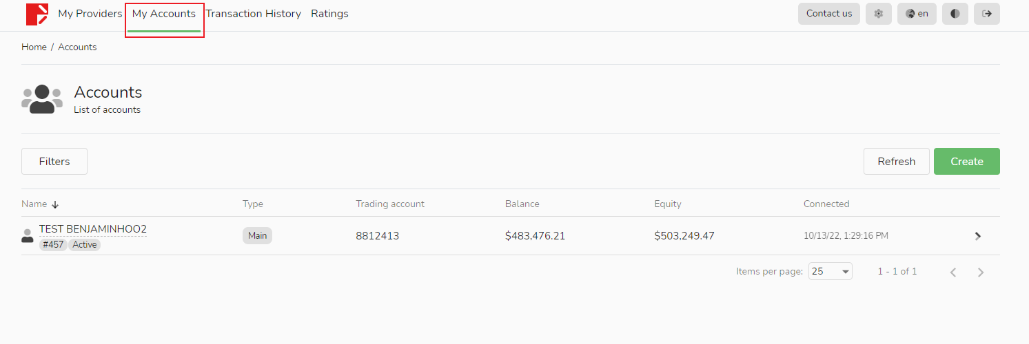 في صفحة [حسابي] لمصدر الإشارة ، يمكنك إضافة حساب تداول جديد بالنقر فوق الزر الأخضر [إنشاء]. ومع ذلك ، لا يمكن استخدام هذا الحساب لتسجيل الدخول ، ويمكن اختياره فقط كمصدر إشارة أو متابع أو إعداد لتلقي رسوم الأداء.