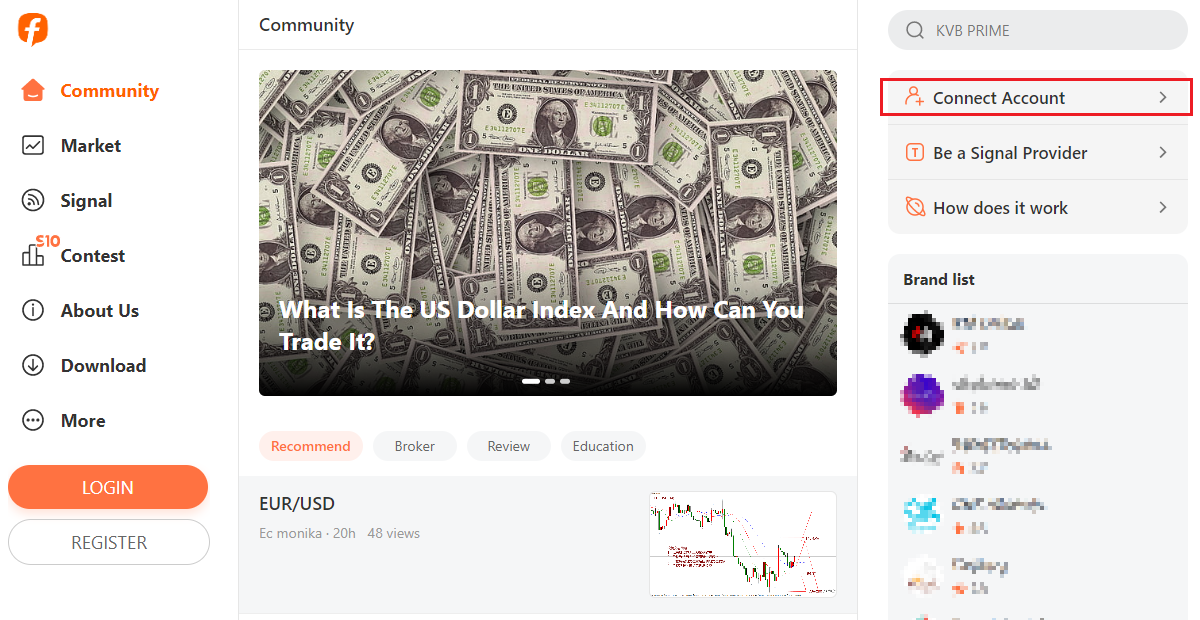 بعد أن يقوم العميل بتسجيل الدخول إلى FOLLOWME، انقر فوق "ربط الحساب" على الجانب الأيمن من الصفحة الرئيسية وابحث عن D Prime في صفحة ربط حساب التداول.