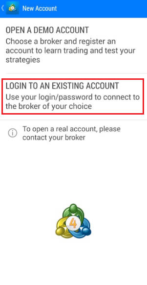 بعد تثبيت إصدار الهاتف المحمول MetaTrader 4 ، انقر لفتح البرنامج للدخول إلى صفحة تسجيل الدخول. إذا كنت قد فتحت بالفعل حسابًا حقيقيًا ، فيرجى تحديد "تسجيل الدخول إلى حساب موجود".