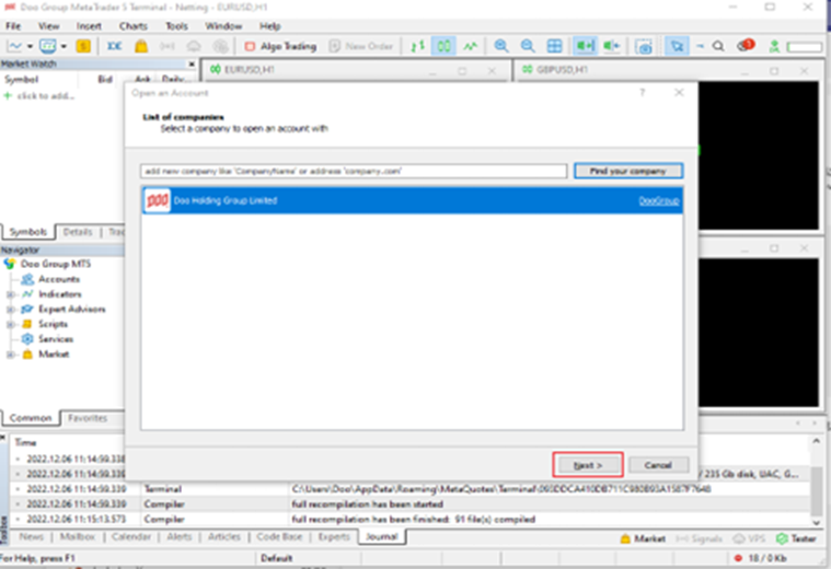 انقر نقرًا مزدوجًا لفتح MT5 ، وحدد [تسجيل الدخول إلى حساب التداول] في شريط القائمة العلوي [ملف] ، ثم ابحث عن خادم التداول المحدد ، وانقر فوق [متابعة]