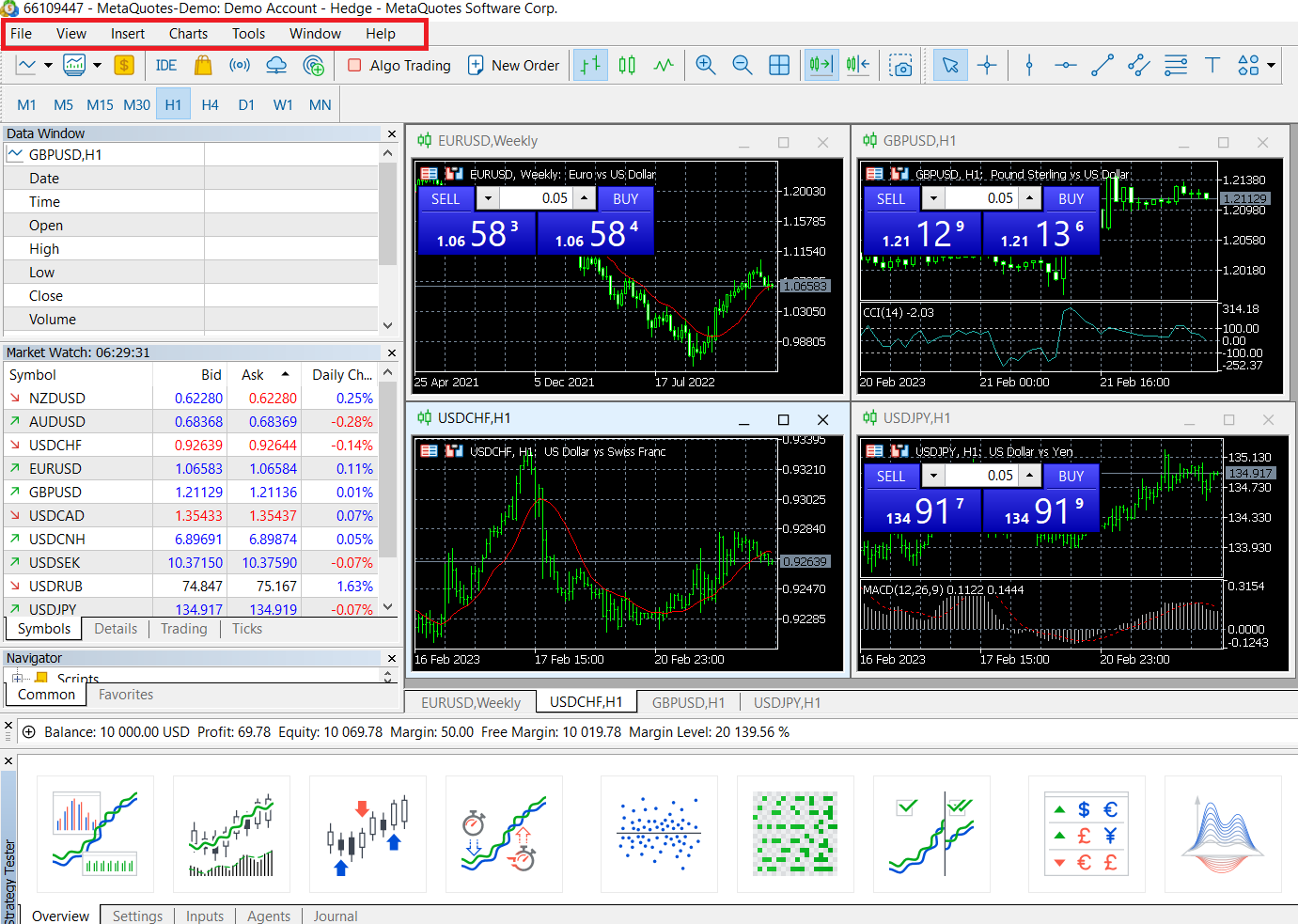 The main menu includes almost all functions in MT5, which help users to perform chart operations, tool analysis and platform settings, etc. The main menu consists of the main functions of [File], [View], [Insert], [Chart Tools], [Window] and [Help].