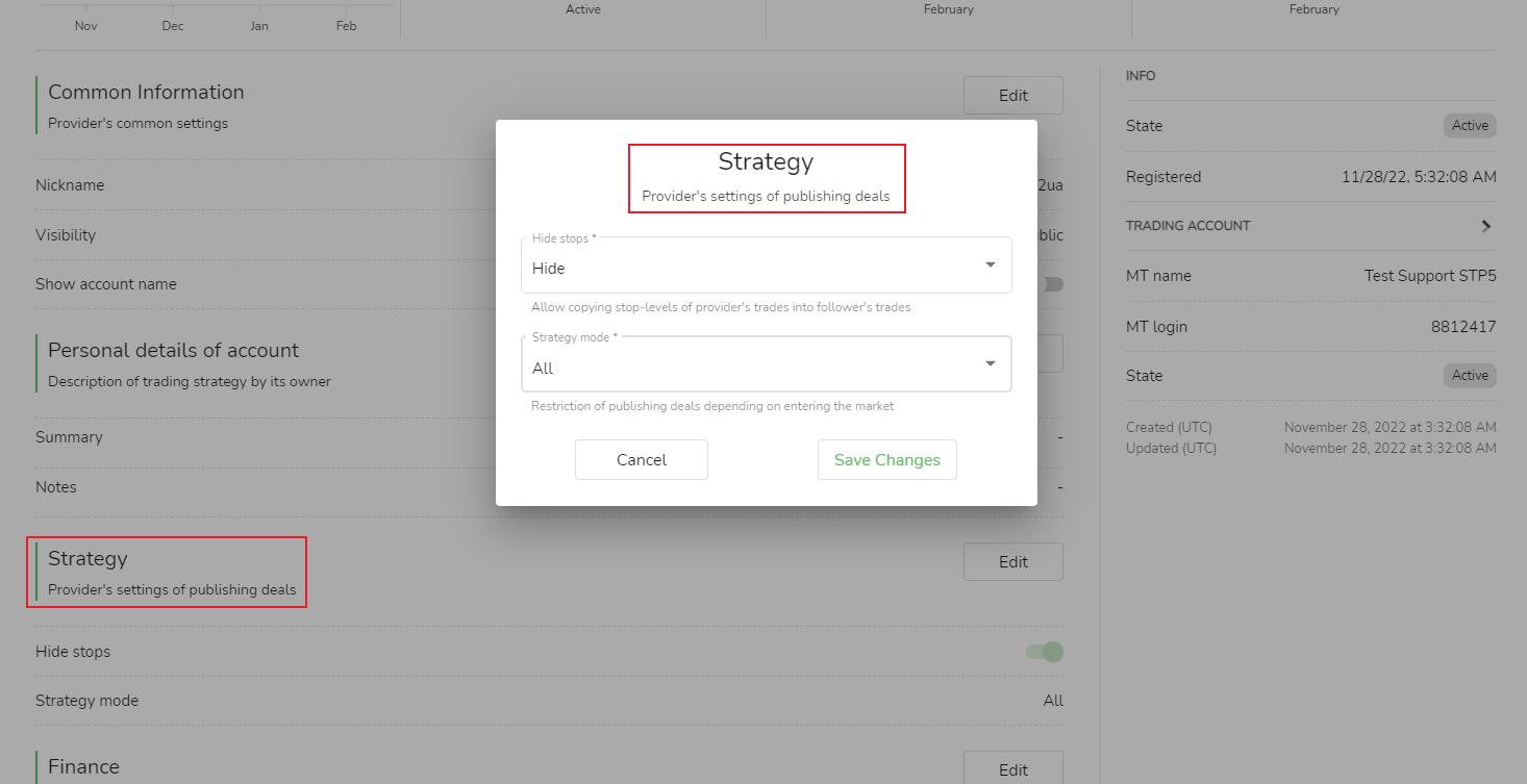 La fuente de la señal puede publicar la configuración de la transacción en [Estrategia]: