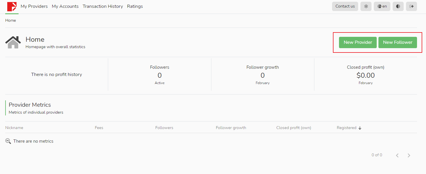 En la página [Mi cuenta] del seguidor, puede agregar una nueva cuenta comercial haciendo clic en el botón verde [Crear]. Sin embargo, esta cuenta no se puede utilizar para iniciar sesión y solo se puede seleccionar como fuente de señal, seguidor o configurada para recibir tarifas de rendimiento.