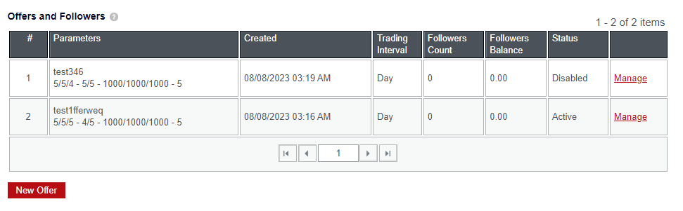 b. Haga clic en "Nueva oferta". La tabla Ofertas y Seguidores muestra información sobre todas las ofertas, su estado, la cantidad de seguidores y el "saldo de seguidores" total para cada oferta.