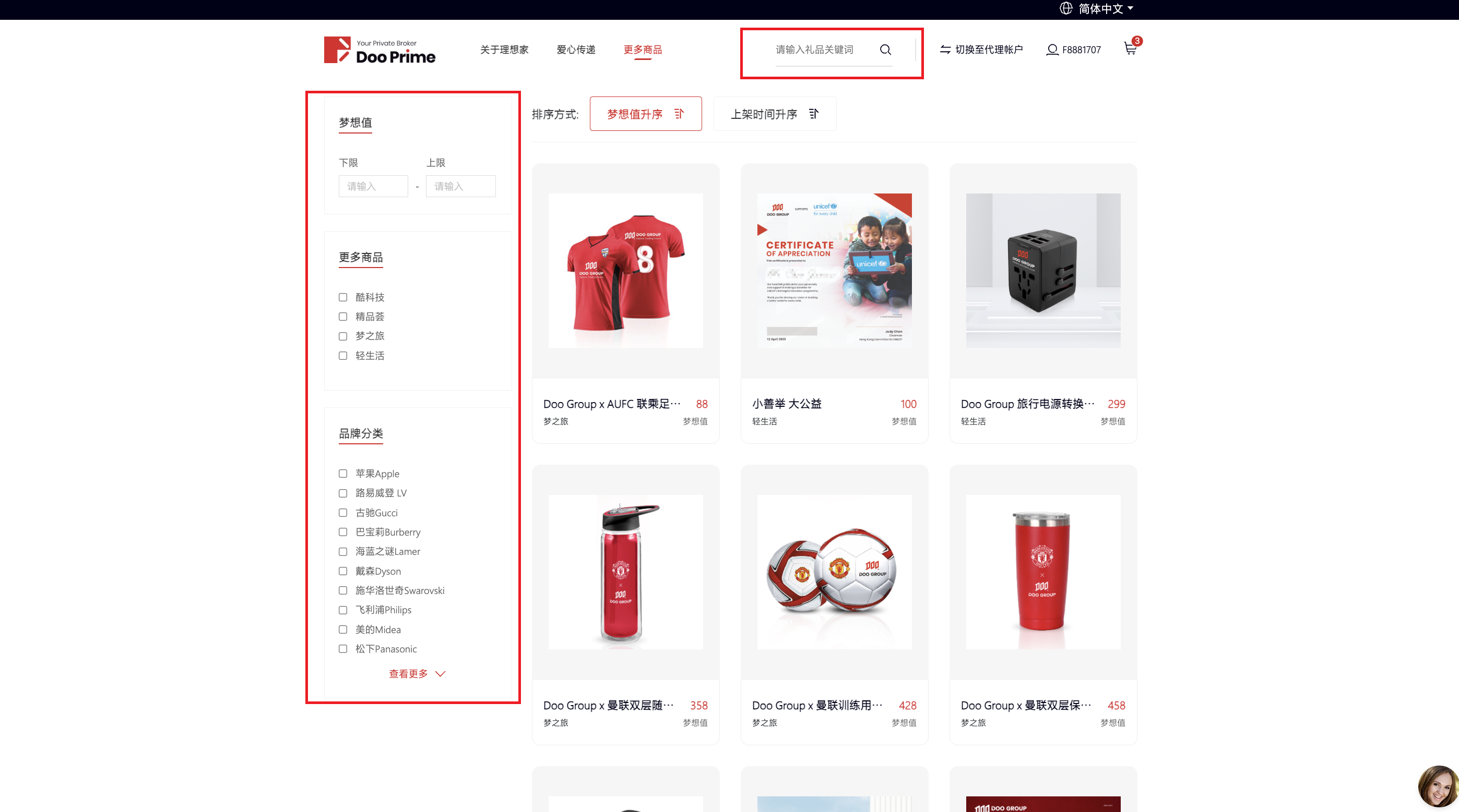 1. 두프라임 "이상적인 집" 포인트몰에 로그인 후 이름/꿈값/카테고리/브랜드별로 원하는 선물을 검색하세요