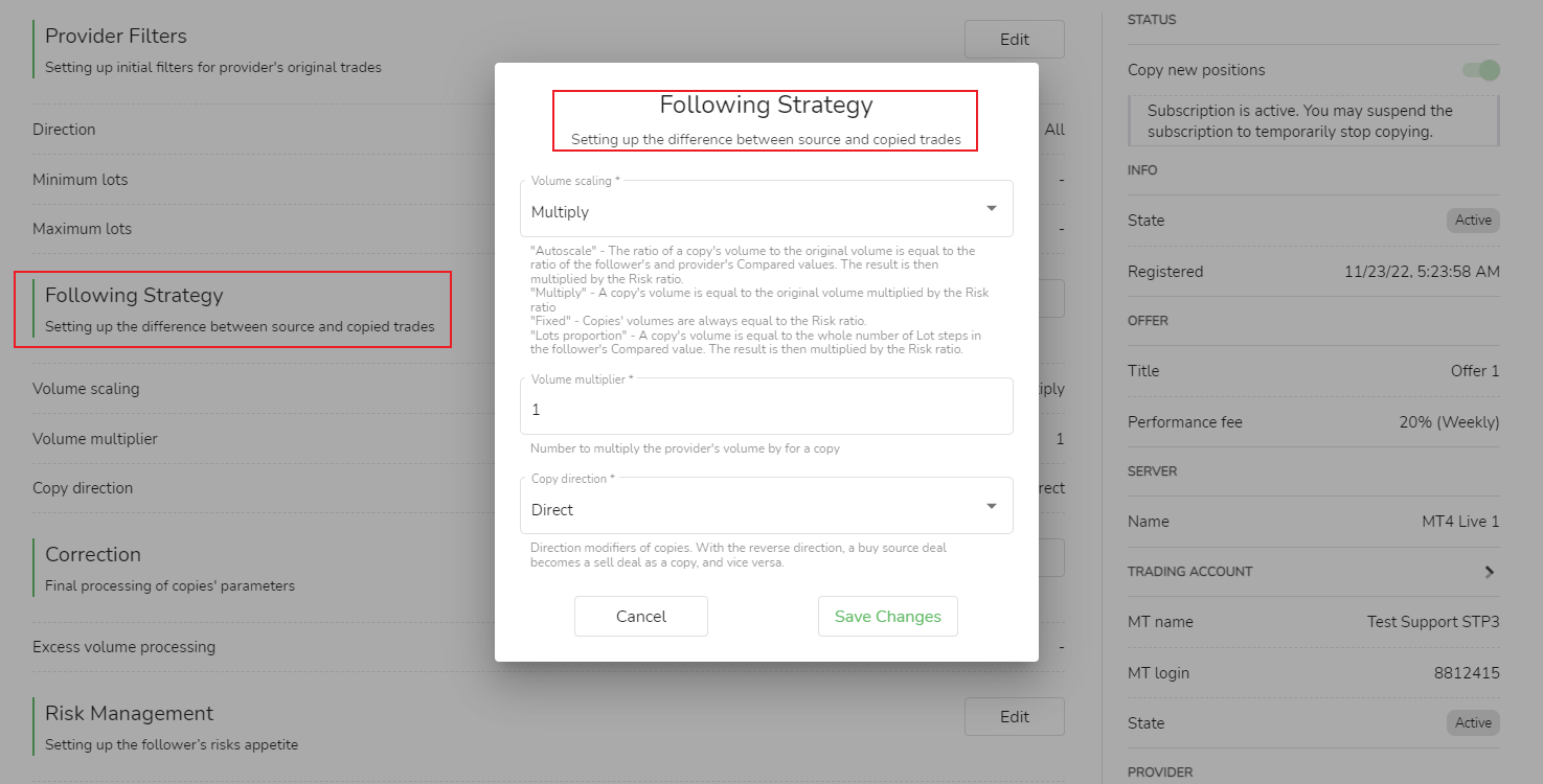 - 수정은 결국 실행될 최대 복사 거래량을 설정합니다. CopyTrading의 추종자는 신호 소스의 거래 포지션의 위험을 제어할 수 있을 뿐만 아니라 그들이 배치해야 하는 위치의 크기에 대한 위험도 제어할 수 있습니다.
