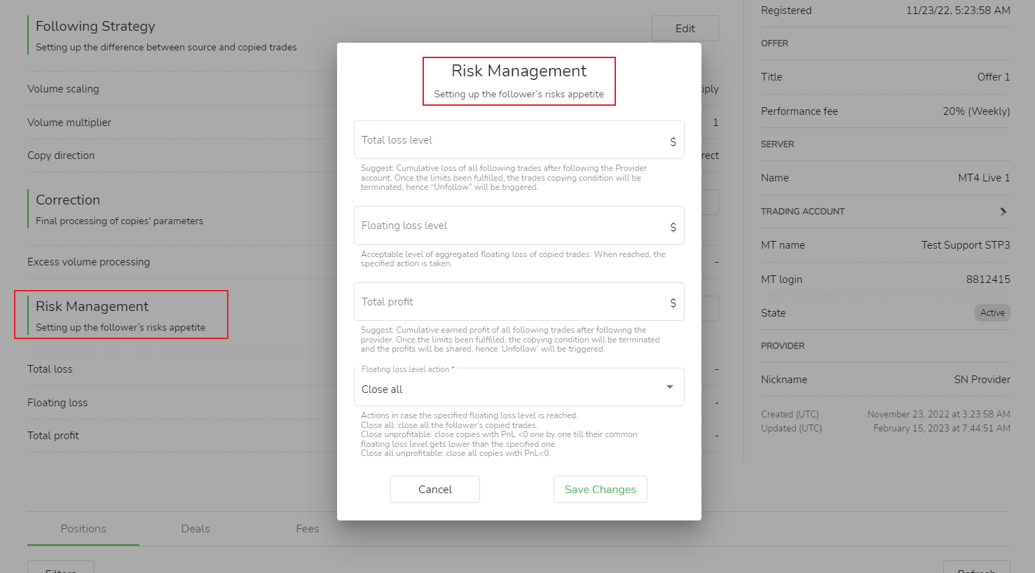 팔로워는 위험 관리에서 이익 실현 및 손절매 수준을 설정하여 자신의 계정 위험을 관리할 수 있습니다.