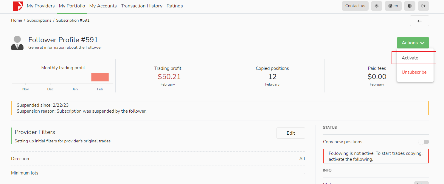 증빙 계정 정보 설정을 완료한 후 추종자는 녹색 [활성화] 버튼을 클릭해야 증빙 조건이 적용됩니다.