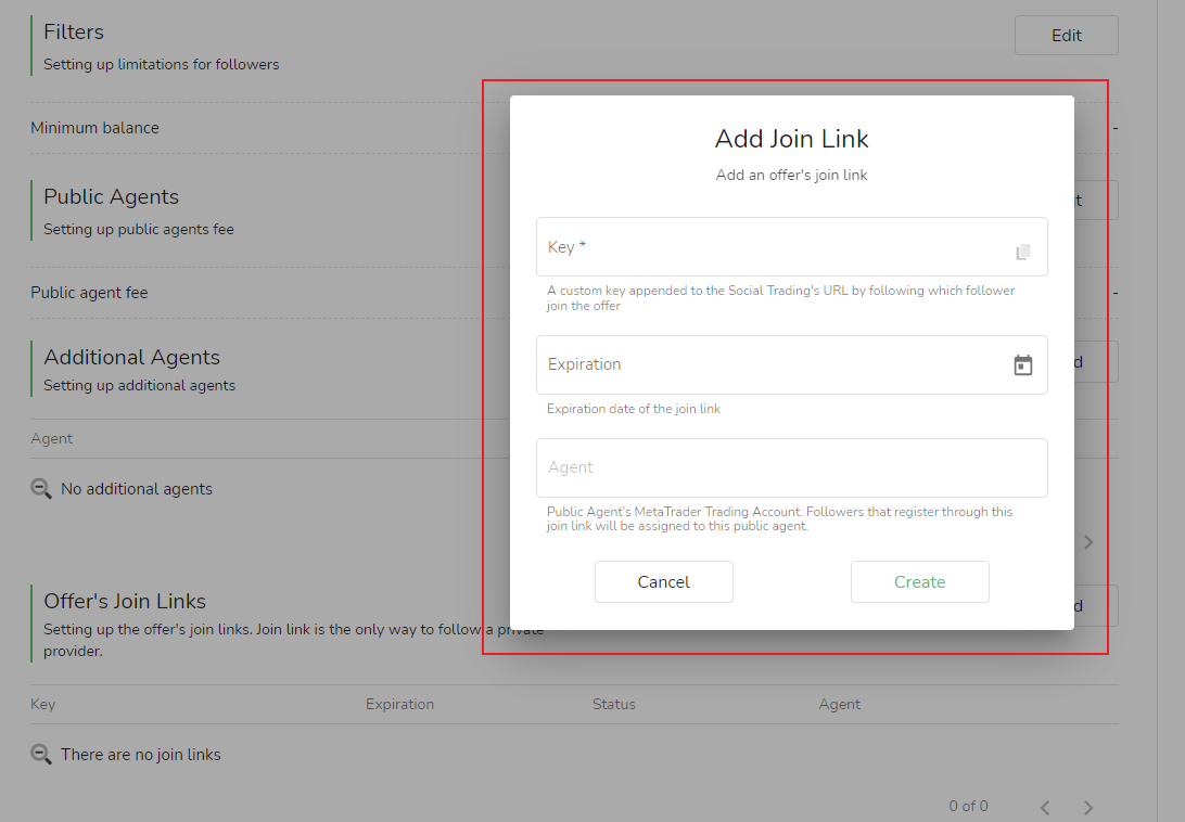 가입 링크가 성공적으로 생성되면 위의 위치에 표시되며, 이 가입 링크는 소개자의 MetaTrader 거래 계정의 매개 변수를 가지므로 가입 링크를 통해 등록된 팔로워는 해당 소개자에게 직접 할당됩니다.