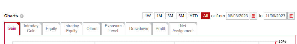 c.사용자가 견적을 생성하거나 마스터 계정 설정을 관리하려면 활성 계정 목록에서 원하는 마스터 계정을 클릭하여 자세한 내용을 확인하세요. 시스템은 선택한 마스터 계정에 대한 수익률, 일일 수익률, 자본, 시세, 노출 수준, 최대 손실액, 이익 및 순 분포를 보여주는 차트를 생성합니다.