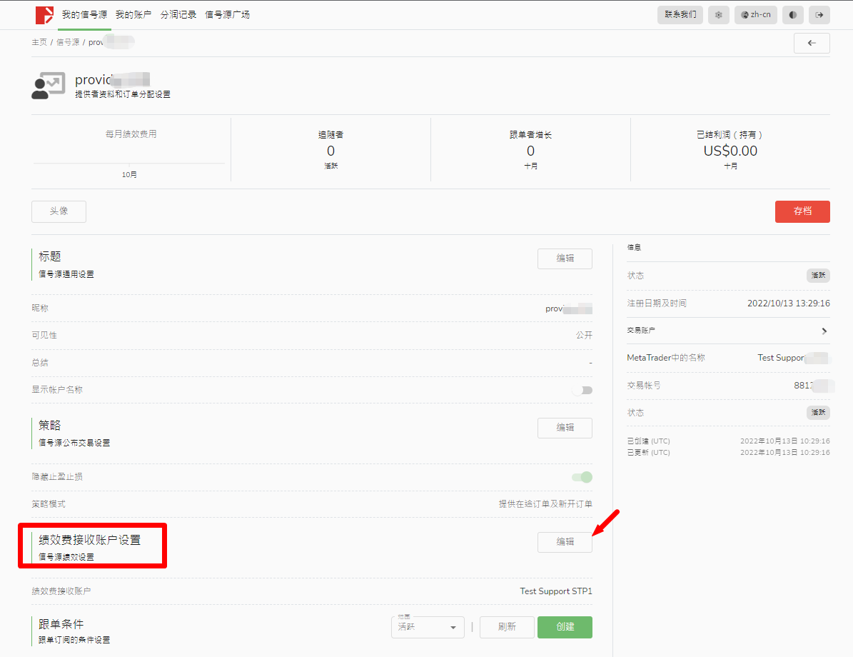 - 在「我的信号源」栏目下,选择「绩效费接收账户设置」,点击「编辑」按钮。