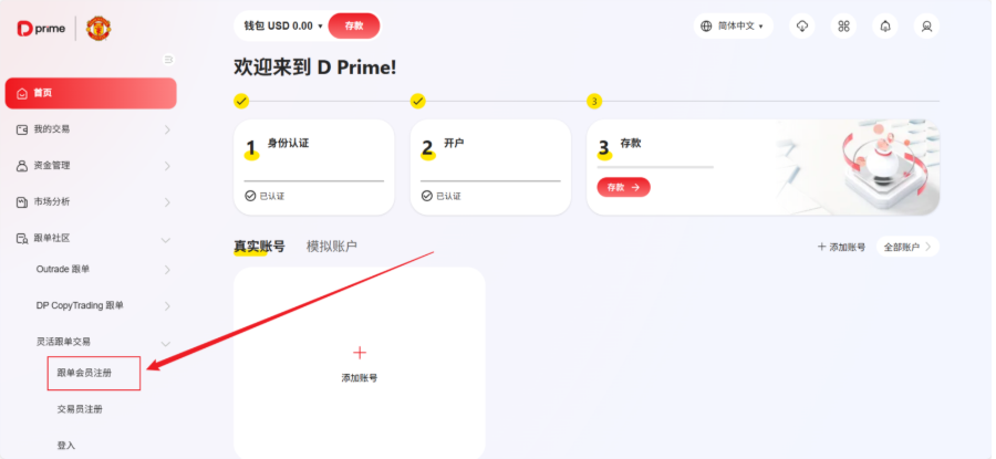第一步: 登录到D Prime客户端, 点击左侧【跟单社区】,点击【灵活跟单交易】,点击【跟单会员注册】。
