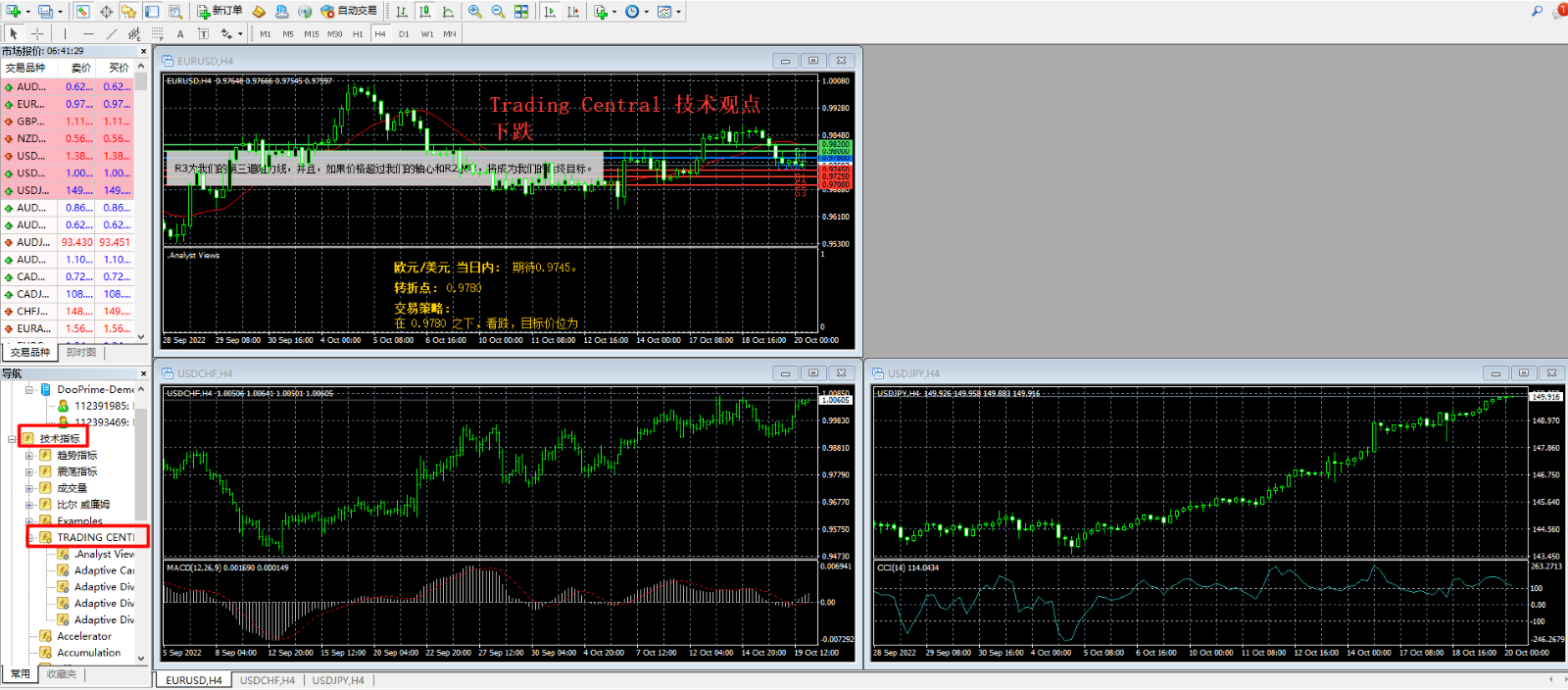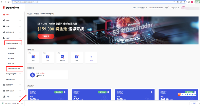 1. 首先请您登录 Doo Prime 用户中心,然后点击左侧菜单栏「分析」后选择「 Download Indicators 」。此时请查看底部菜单栏, Trading Central 指标已经下载完成。