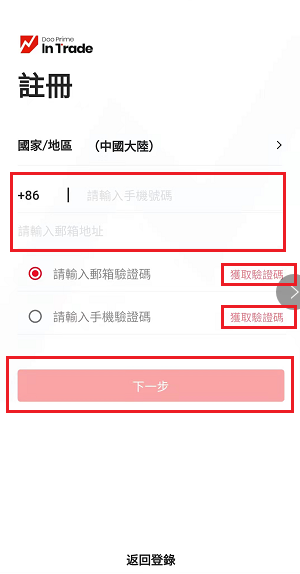 然後輸入手機號碼及郵箱地址,然後點擊獲取驗證碼以通過郵箱及手機的驗證,完成後按下一步。