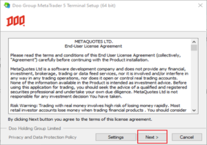 MT5 Windows 桌面版下載完成後,根據安裝指引點擊圖中的【Next】,便可開啟安裝。