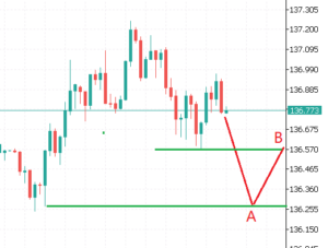 b)投資者預計USDJPY將會下破A線阻力位位,然後反彈B線受到阻擋再次下跌,於是就可以使用Sell Stop Limit訂單類型;