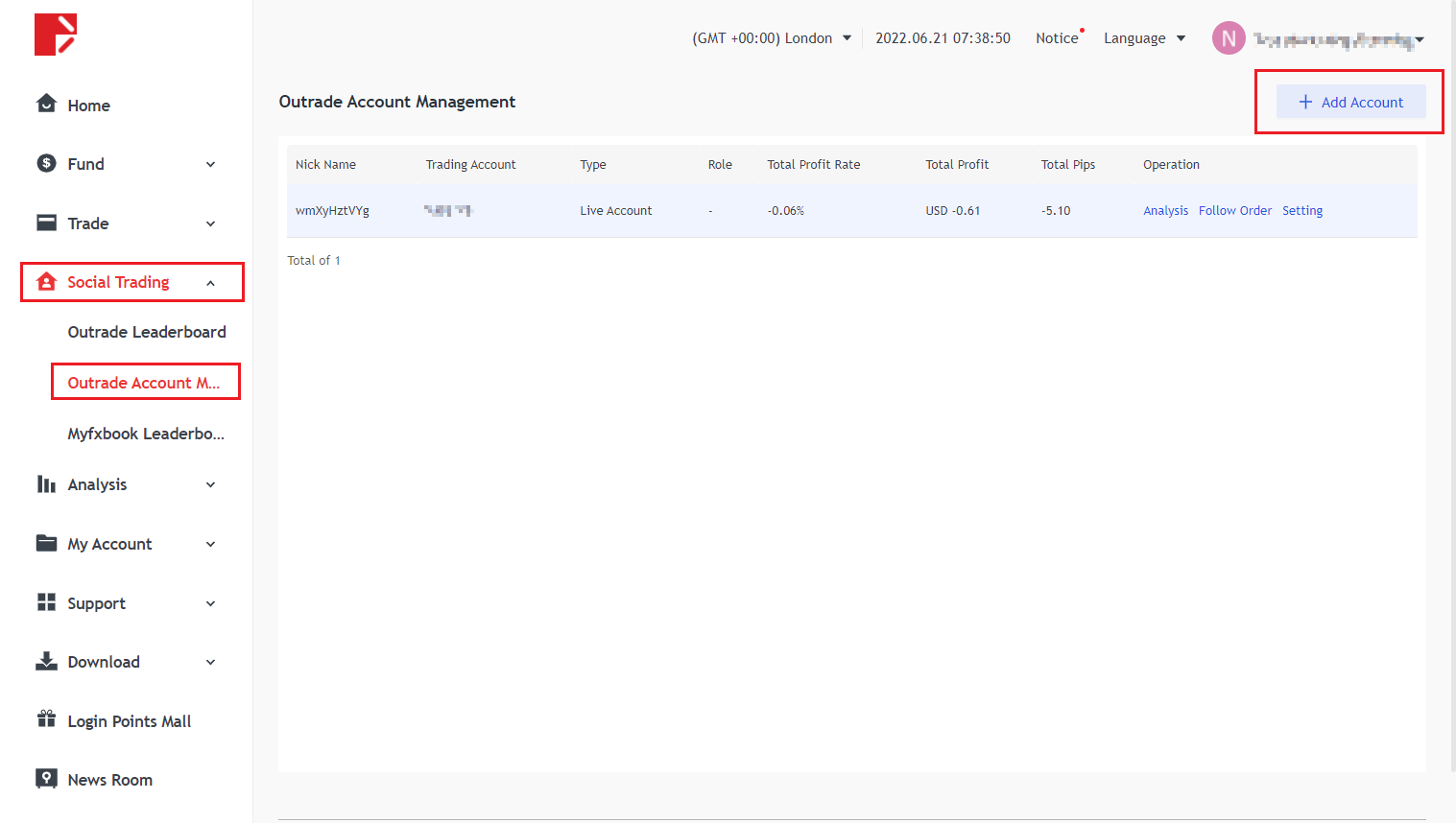 Đăng nhập vào Trung tâm người dùng Doo Prime của bạn, nhấp vào "Giao dịch cộng đồng" ở phía bên trái của trang chủ, nhấp vào "Quản lý tài khoản ngoại hạng", nhấp vào Thêm tài khoản ở phía bên phải của trang, chọn vai trò "Nhà giao dịch" hoặc "Người theo dõi" , và cuối cùng ràng buộc tài khoản là Can.